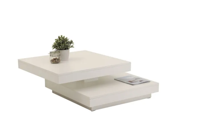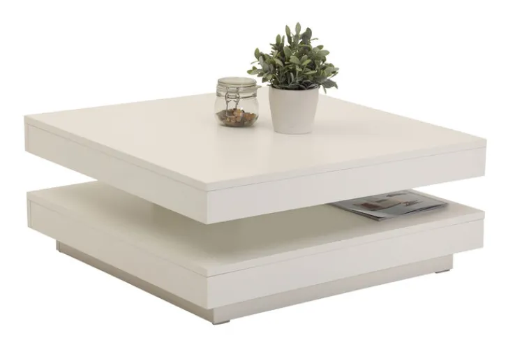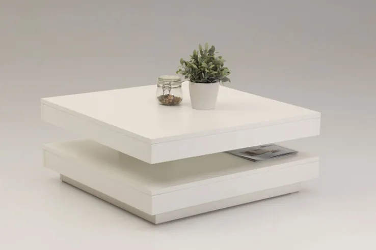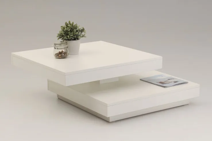Der Couchtisch setzt sich aus einer quadratischen Ablage und einer Tischplatte zusammen. Diese sind durch ein Gestell miteinander verbunden, das von außen nicht sichtbar ist. So entsteht der Eindruck, dass die beiden Platten schweben. Die Ablage ist drehbar, was eine hohe Flexibilität mit sich bringt. Darüber hinaus kann der hochwertige Tisch mit einer herausragenden Materialqualität überzeugen. Er besteht nämlich aus einer stabilen Holznachbildung und ist außerdem hervorragend verarbeitet. Das Design begeistert mit modernen und sehr minimalistischen Elementen, die wunderbar in eine urbane Einrichtung passen.