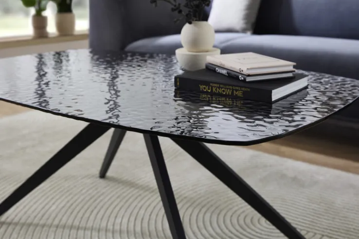 Der moderne ELIAS Couchtisch schafft auf 110 x 70 cm viel praktische Abstellfläche vor dem Sofa oder der heimischen großen Wohnlandschaft. Die schwarzen Standbeine wurden pulverbeschichtet und spreizen nach außen hin ab, was frontal für zusätzliche Beinfreiheit vor dem Sofa sorgt – ebenso wie für eine moderne und stilvolle Raumwirkung.