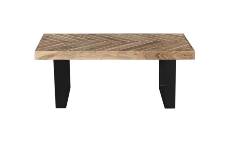 Der 110 x 60 cm große Couchtisch LUANDA begeistert mit einem besonderen Chic und präsentiert sich aus massiver Akazie im Farbton Natur sowie einem stabilen schwarzen Kufengestell aus Metall.