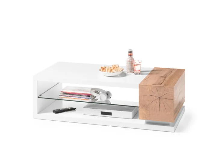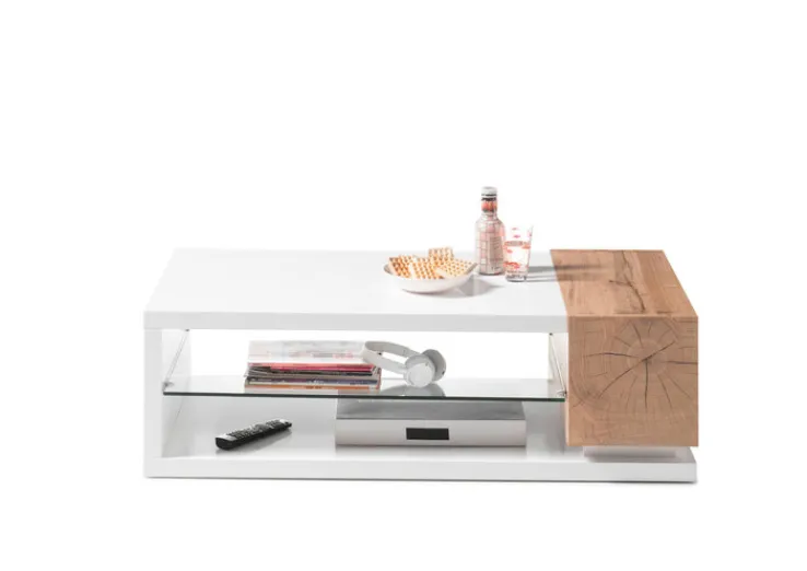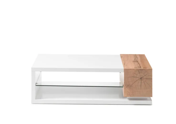 Ein Tisch mit Wow Faktor ist der Couchtisch SILVO in matt lackiertem Weiß mit Glaseinsatz und einer Absetzung in Eiche Hirnholzoptik. Mit einem Maß von 120 x 36 x 60 cm ist der Couchtisch perfekt zur Positionierung vor dem Sofa geeignet.