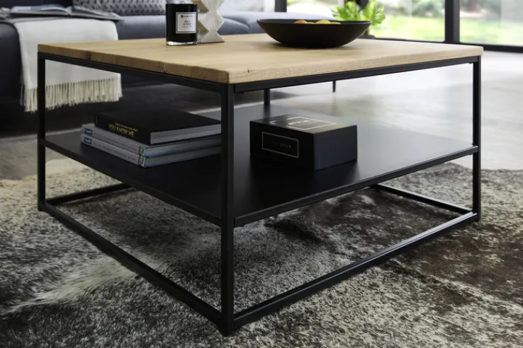 Der Couchtisch aus der Serie TILDA vereint modernes Design mit industriellem Charme. Die Tischplatte aus massiver Eiche verleiht dem Tisch eine natürliche und warme Ausstrahlung, während das Vierkantgestell aus schwarzem Metall für Stabilität und einen modernen Look sorgt. Mit einer quadratischen Form und den Maßen von 75 cm Breite und Länge sowie einer Höhe von 40 cm passt dieser Tisch perfekt in verschiedene Wohnräume.
