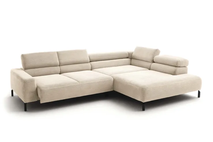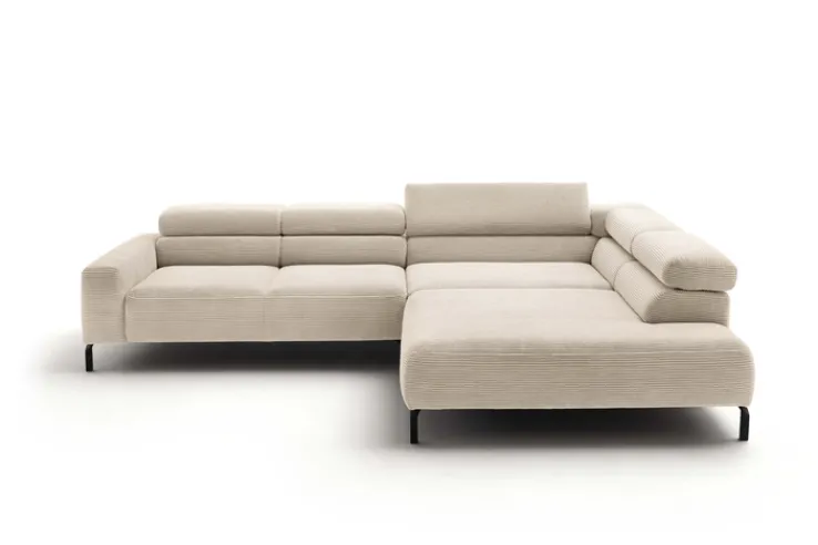 Das Ecksofa „Quartier“ präsentiert sich in einem modernen Design und bietet eine komfortable Sitzgelegenheit für Ihr Zuhause. Mit einer Breite von 309 cm und einer Tiefe von 219 cm passt es ideal in größere Wohnräume. Die Sitzhöhe beträgt 46 cm, während die Sitztiefe zwischen 72 und 90 cm variiert, was für zusätzlichen Komfort sorgt. Die maximale Höhe des Sofas liegt zwischen 74 und 88 cm, was durch die verstellbaren Kopfstützen ermöglicht wird. Insgesamt sind fünf Kopfstützen im Lieferumfang enthalten, die individuell angepasst werden können. Das Sofa ist in einem eleganten Beigeton gehalten, der als „Nature“ bezeichnet wird, und besteht aus einem strapazierfähigen Cordstoff. Der Textilbezug besteht zu 88 % aus Polyester und zu 12 % aus Polyacryl, was für Langlebigkeit und Pflegeleichtigkeit sorgt. Die Polsterung aus PUR-Schaum und Nosagfederung bietet optimalen Sitzkomfort. Die schwarzen Metallfüße in matter Optik verleihen dem Sofa einen stabilen Stand und runden das moderne Erscheinungsbild ab. Dank der motorischen Verstellung und der gepolsterten Ausführung bietet das Sofa zusätzlichen Komfort und Flexibilität.