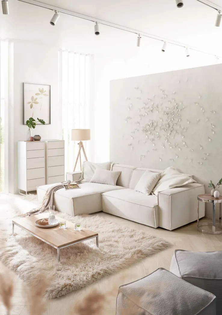 Das hochwertige Ecksofa UPPER EAST hat die Maße 168 x 276 cm und präsentiert sich elegant mit Bezügen in der Farbe Weiß. Durch das schlichte Design und die geradlinige Optik passt das Sofa in das modern eingerichtete Wohnzimmer und ist mit diversen Einrichtungsstilen kombinierbar. Für einen hohen Sitzkomfort sorgen weicher PUR-Schaum auf einer Stahlwellenfederung, ein festes Armteil und ein hautsympathischer Feincord-Bezug. Das Ecksofa schafft eine gemütliche Atmosphäre.