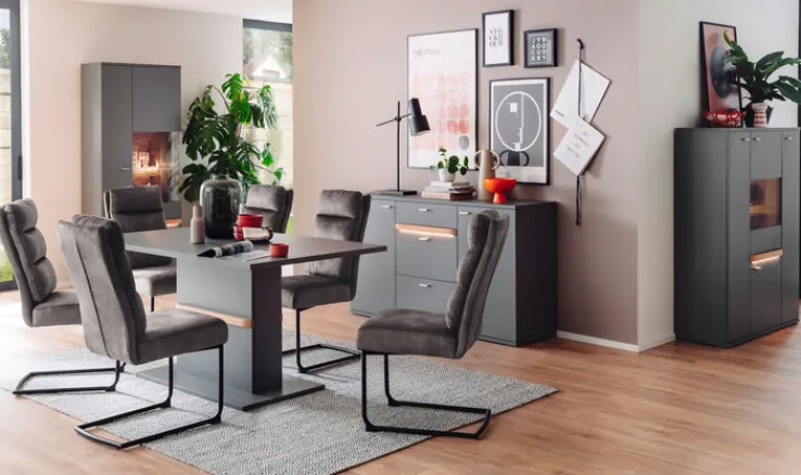 Der graue Esstisch CHARLOTTE begeistert auf den ersten Blick mit einem stylischen Look. Er harmoniert perfekt mit den Wohn- und Esszimmermöbeln der CHARLOTTE-Serie und verleiht dem Wohnraum eine moderne Atmosphäre zum Wohlfühlen.