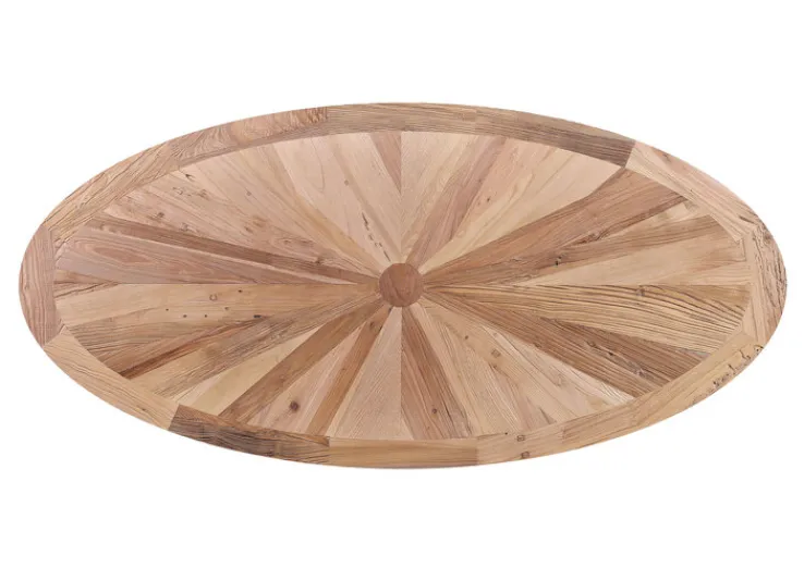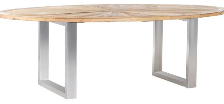 Die ovale Tischplatte wird bei diesem Esstisch aus alter und daher besonders widerstandsfähiger Ulme gefertigt. Zuvor durchläuft das Altholz einen durchdachten Recyclingsprozess, welcher es auf die weitere Verwendung vorbereitet. Durch den Einsatz sehr unterschiedlicher Hölzer erhält die Tischplatte eine facettenreiche Optik, sie beschäftigt damit die Augen der am Tisch sitzenden Personen. Getragen wird die sehenswerte Platte von einem soliden Edelstahlgestell, das mit seiner Gestaltung in U-Form dem Möbel optimalen Stand auf allen Fußböden verleiht.