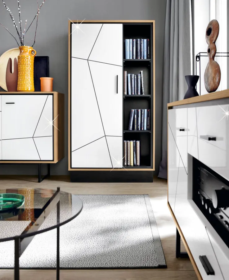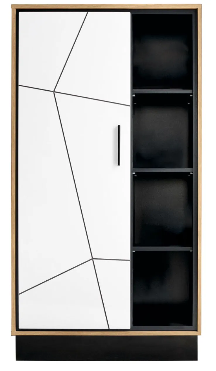 Das Highboard BROLO kombiniert einen braunen Korpus in Carania Eiche mit perlschwarzem Innenleben und einer weißen Tür. Schwarze Absetzungen an der Front und ein moderner Griff unterstreichen das stylische Design des Möbelstücks. Überzeugen kann das moderne Highboard außerdem mit jeder Menge Stauraum. In vier offenen Fächern bietet er Platz für Bücher und Dekorationen. Hinter der Drehtür mit Soft-Close lassen sich Alltagsgegenstände vor Staub und Blicken geschützt aufbewahren.