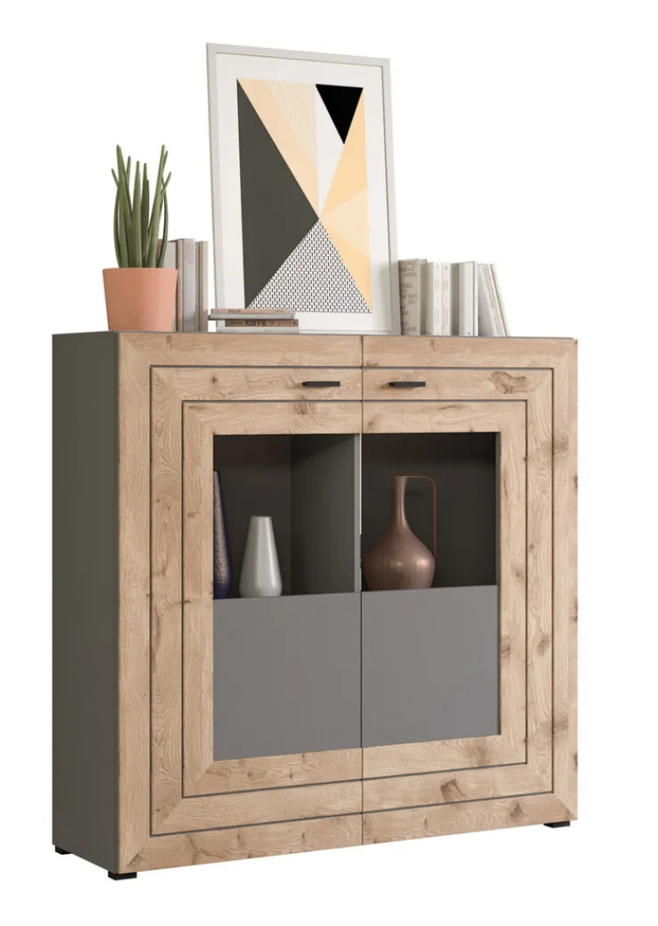 Das 2-türige Highboard FRENO in den Dekoren Nox Oak und Grau überzeugt durch sein stilvolles Design und passt in moderne Raumkonzepte. Platziert an einer freien Wand in einem geschmackvoll eingerichteten Wohn- oder Esszimmer, ist das Highboard ein Blickfang und fügt sich harmonisch ein. Hinter den Drehtüren mit Glaseinlage befinden sich vier Einlegeböden, die viel Platz für Geschirr, Tischwäsche und Wohnaccessoires bieten. Die Oberplatte des Highboards lässt Raum für verschiedene Dekorationsideen.