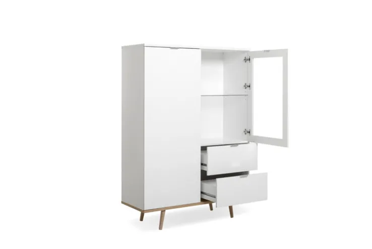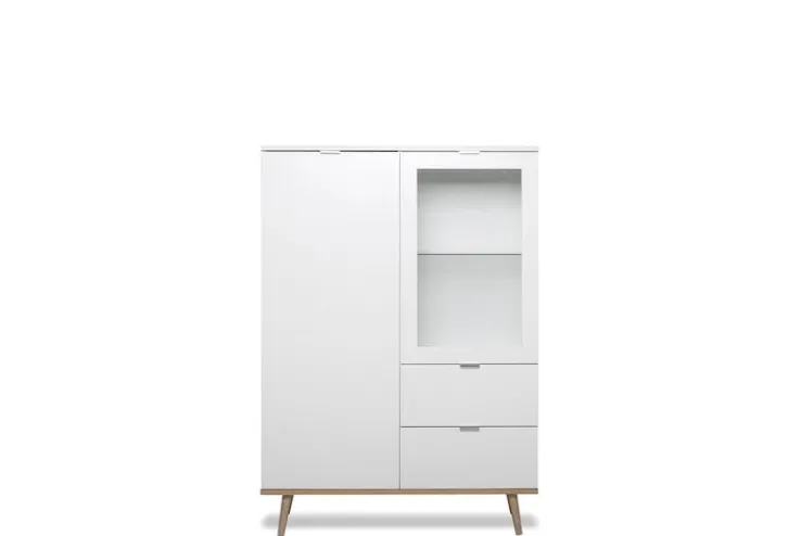 Aufgeteilt ist das Highboard GÖTEBORG von QUARTIER in zwei Bereiche. Links befindet sich ein durch die Drehtür erreichbarer Stauraum mit zwei Einlegeböden. Rechts sorgen zwei Schubladen und eine mit Klarglasdrehtür verschlossene Vitrine für Platz. Das Highboard steht auf Füßen aus massivem Eichenholz. Das beliebte Design des halbhohen Schranks hat der Hersteller zusätzlich in passenden Vitrinen, Lowboards und Kommoden umgesetzt.