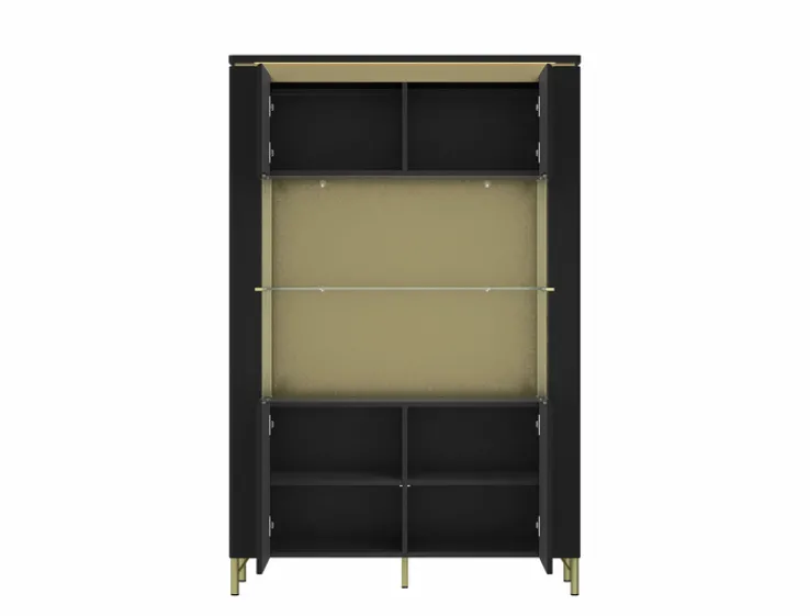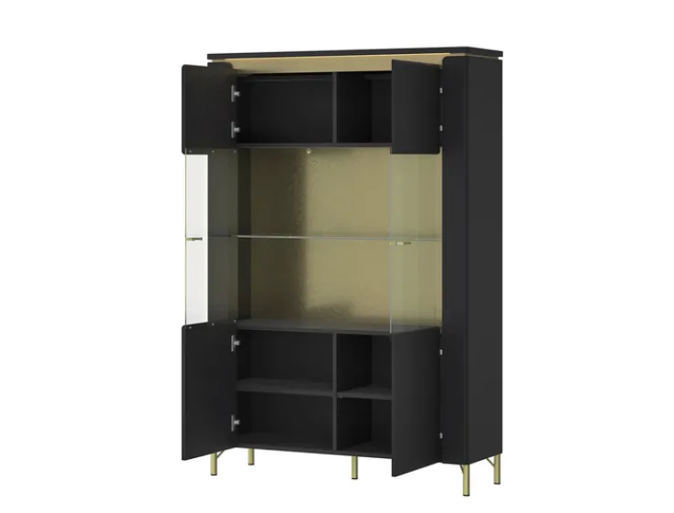 Der Highboard NORICA mit den Maßen 110,4×169,2 cm verleiht jedem Wohnbereich mit seiner matt schwarzen Oberfläche eine elegante Note. Das 40 cm tiefe Highboard verfügt über zwei Drehtüren, hinter denen insgesamt sechs Einlegeböden praktischen Stauraum bieten. Die mittleren Türbereiche sind aus Glas gefertigt und werden durch integrierte Beleuchtung von oben stilvoll in Szene gesetzt.