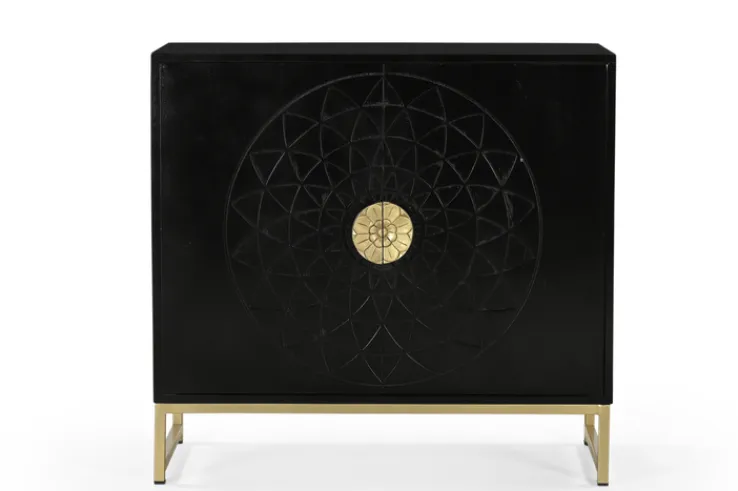 Die Kommode ARAS besteht aus schwarzem Holz. Sie misst in Breite und Höhe 85 x 80 cm. Ihr Kufengestell zeigt goldfarbiges Metall. Weiterhin verfügt das Möbel über 2 Drehtüren. Seine Tiefe liegt bei 35 cm.