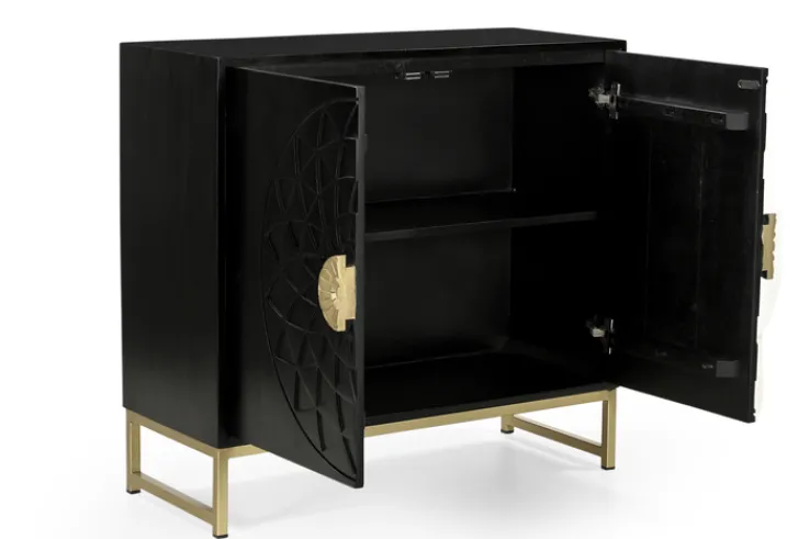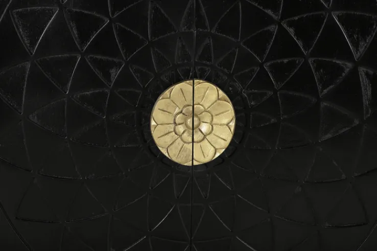Diese schicke Kommode ist im Stil des Art Déco gefertigt. Das Gold des Gestells findet sich in den großen, halbmondförmigen Griffen wieder. Sie präsentieren zusammen ein Blumendekor. Die schwarze Front zeigt ihrerseits ein großes, grafisches Muster Ton in Ton, das ebenfalls an eine Blume erinnert. Hinter den beiden Drehtüren finden sich zwei Fächer, getrennt durch einen Einlegeboden. Dieses Möbel braucht unbedingt einen gut sichtbaren Stellplatz.