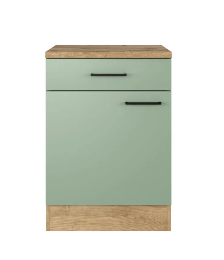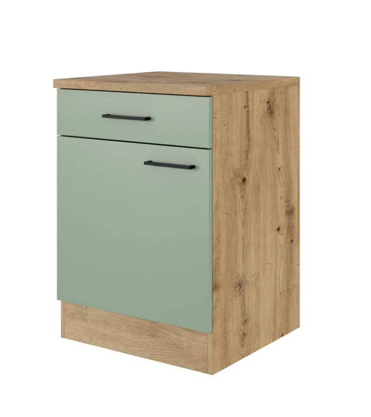 Der Küchen-Unterschrank bietet eine praktische und stilvolle Lösung für Ihre Küche. Mit einer Breite von 60 cm, einer Höhe von 85 cm und einer Tiefe von 60 cm passt er perfekt in verschiedene Küchenlayouts. Der Schrank ist in einem ansprechenden Schilfgrün gehalten, das in Kombination mit der Artisan Eiche Nachbildung eine moderne und natürliche Optik verleiht. Die Fronten bestehen aus einer Holznachbildung mit Melaminharzbeschichtung, was für Langlebigkeit und einfache Pflege sorgt. Der Unterschrank verfügt über eine Drehtür und eine Schublade, die ausreichend Stauraum für Küchenutensilien bieten. Ein Einlegeboden ermöglicht eine flexible Organisation des Innenraums. Die schwarzen Griffe setzen einen eleganten Akzent und erleichtern die Handhabung. Die Kombination aus grünem Farbton und Eiche-Dekor macht diesen Schrank zu einem vielseitigen Möbelstück, das sich harmonisch in verschiedene Einrichtungsstile einfügt.