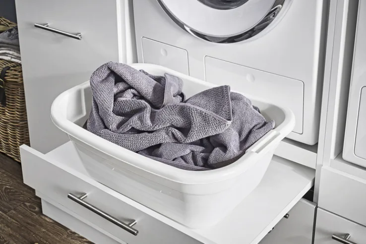 Darüber hinaus verfügt das außergewöhnliche Möbelstück über Stauraum und eignet sich somit für die Aufbewahrung von Waschmittel, Weichspüler, Wäschenetzen und -klammern ideal. Zwei Türen und ein Schubkasten ermöglichen eine individuelle Aufteilung der Nutzfläche. Die Softclose-Technologie sorgt dafür, dass sie leise schließen. Außerdem können die Füße des Maschinenschranks in der Höhe verstellt werden.