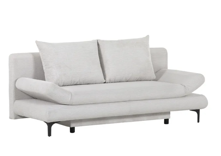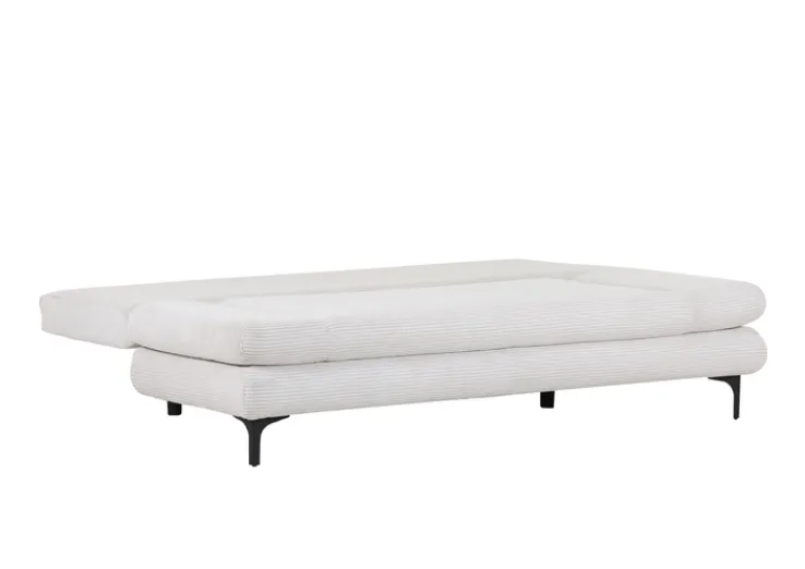 Das beigefarbene TORRES Schlafsofa besticht tagsüber mit seiner reduzierten und sehr modernen Formsprache, unter anderem aufgrund der angewinkelten Sitzfläche. Die gerade Rückenlehne sorgt für die nötige Stabilität, während die Standfüße zugleich als Blickfang und schwarzer Kontrast zu dem weichen Stoffbezug agieren. Der besteht aus Cord und ist damit sehr robust und pflegeleicht.