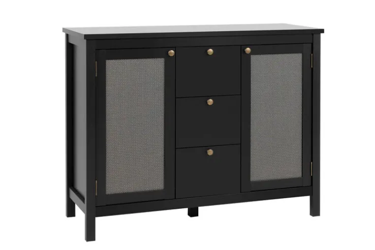 Das dekorative Geflecht in den Türen verleiht Sideboard CORDOBA seinen besonderen Charme. Dahinter verbirgt sich jeweils ein Einlegeboden und jede Menge Stauraum. Im Mittelbereich bieten drei geräumige Schubladen Platz für Schreibwaren, elektronische Geräte oder andere Kleinigkeiten, die im Alltag so gern verloren gehen. Ein ebenso hübsches wie praktisches Möbelstück für jeden Einrichtungsstil