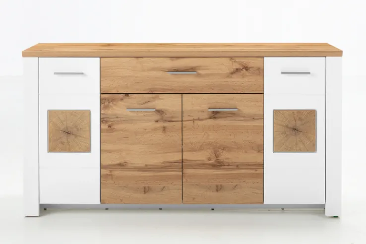 Das Sideboard aus der Serie RAMIRA kombiniert modernes Design mit klassischer Eleganz. Mit einer Breite von 164 cm, einer Höhe von 87 cm und einer Tiefe von 46 cm bietet es großzügigen Stauraum. Die vier Drehtüren und ein Schubkasten sind praktisch und funktional gestaltet. Die Hauptfarbe ist Weiß, ergänzt durch braune Elemente und eine Eiche-Dekorfarbe, die eine Altholz- und Hirnholz-Nachbildung zeigt. Diese Kombination verleiht dem Möbelstück eine warme und einladende Optik.