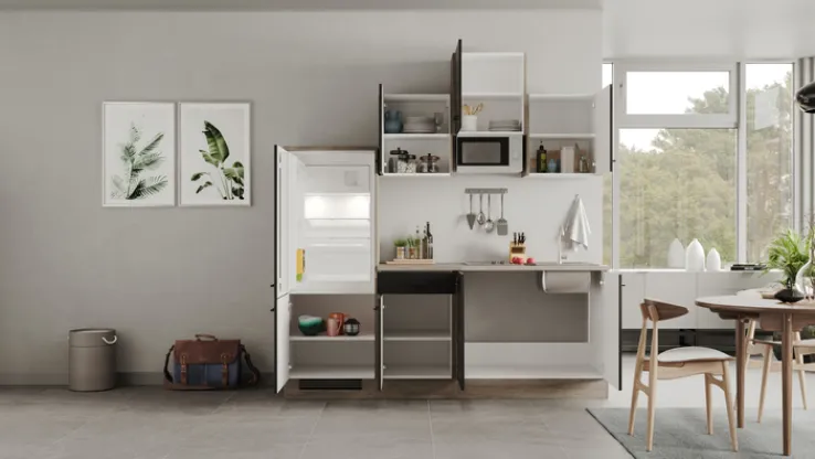 Die kompakte MARY Touch Singleküche hüllt sich auf rund 210 x 205 x 60 cm nahezu komplett in Schwarz, lediglich der untere Teil aus Endgrain Oak Dekor setzt einen gekonnten hellen Kontrast. Ideal für kleinere Wohnungen und Single-Haushalte, bietet die Küche genügend Freiraum für eine bis zwei Personen. Küchengeräte sind bei der Singleküche MARY Touch schon enthalten. Die Küchenzeile bringt sowohl eine Mikrowelle als auch einen Kühlschrank, eine Glaskeramik-Doppelkochplatte und Spüle mit. Damit können sich auch Hobbyköche voll und ganz ausleben. Die Metallbügelgriffe verleihen der Singleküche indes einen eleganten Akzent, auch die individuelle Anordnung der Hängeschränke unterstreicht die stilvolle Formsprache.