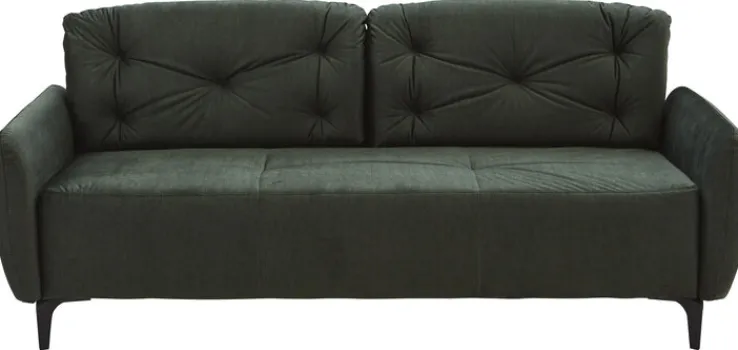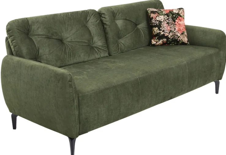 Das Sofa VENTA ist ein stylisher 3-Sitzer in der außergewöhnlichen Farbgebung Dunkelgrün. Das mondäne Exemplar verkörpert puren Chic und passt in ein elegantes Wohnzimmer. Die Zierkissen sind mit einer dekorativen Knopfsteppung versehen und laden zum Ankuscheln ein. Da das Sofa auch rückseitig bezogen ist, eignet es sich, um als freistehendes Element der Wohnlandschaft ein Highlight zu verleihen.