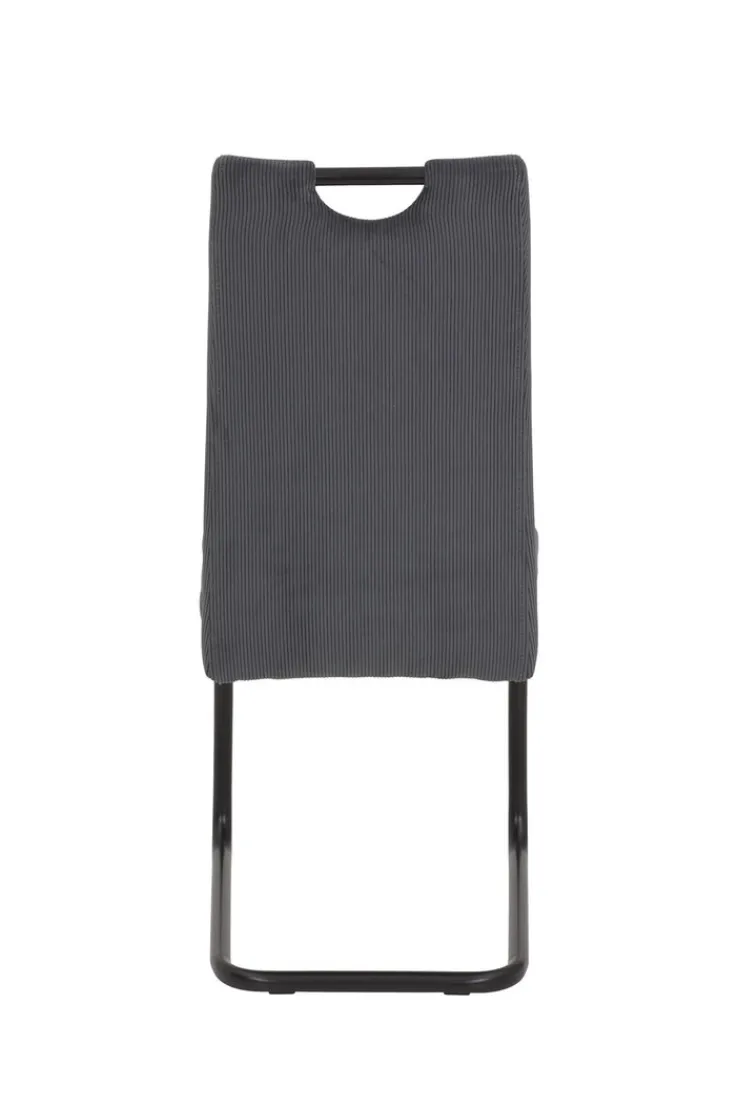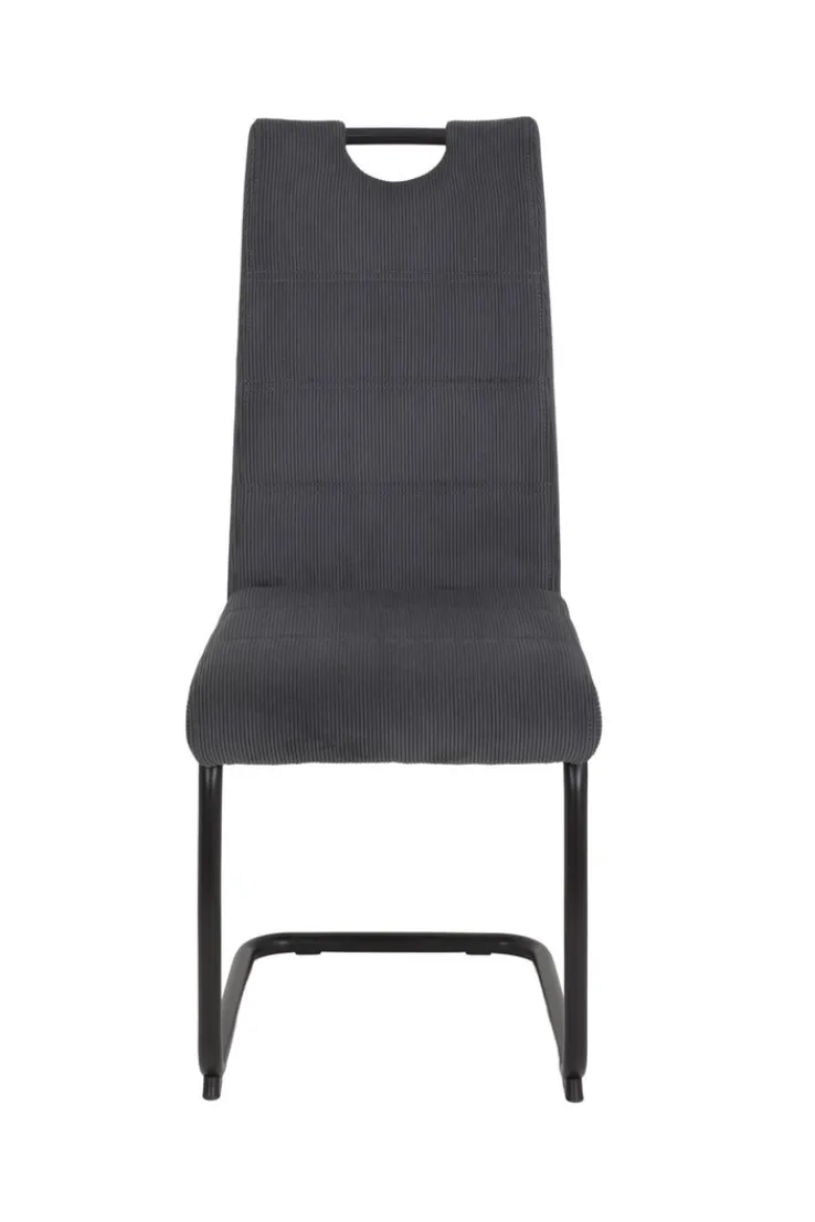 Der Stuhl NEREA von QUARTIER kombiniert einen Bezug aus Webstoff Cord im Farbton anthrazit mit einem schwarzen Schwinggestell. Er ist vielseitig verwendbar und strahlt schlichte Eleganz aus.