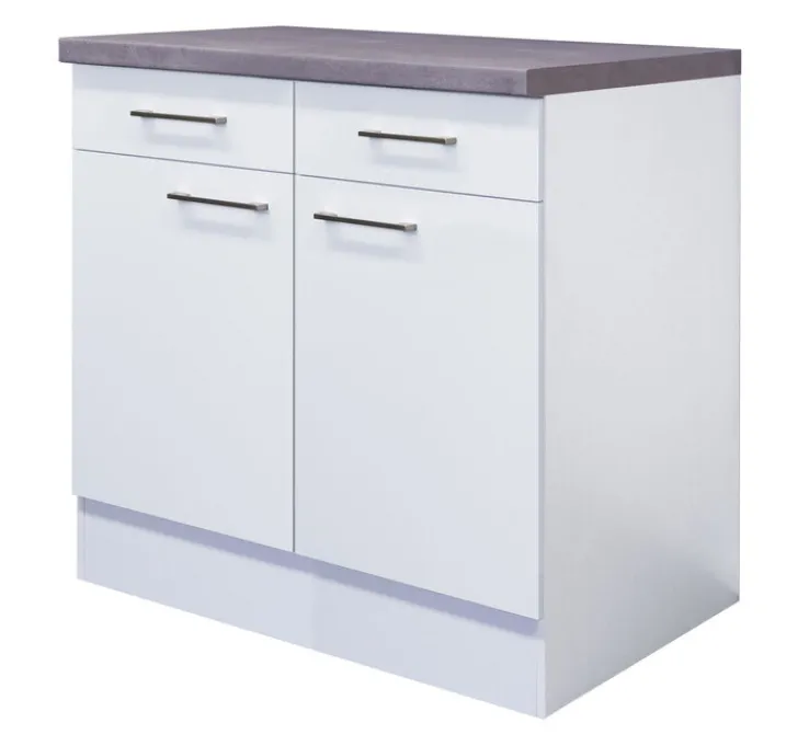 Der 2-türige Unterschrank MEGGIE von QUARTIER überzeugt mit einem zeitlosen Design. Durch die Fronten in der Farbe Weiß, edelstahlfarbige Griffe und die dunkle Arbeitsplatte passt der Schrank mit den Maßen 80 x 86 x 57 cm in den modernen Küchenblock und ist vielseitig kombinierbar. Für Besteck und Kleinteile sind zwei Schubkästen vorhanden. Hinter den Drehtüren ist der Unterschrank mit einem Einlegeboden unterteilt und bietet Platz für Töpfe, Schüsseln und Geschirr.