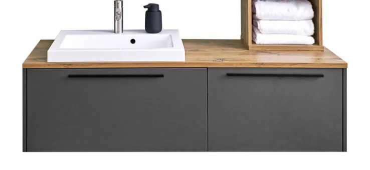Der formschöne Waschtisch JOHN im Dekor Flagstaff Oak und in der Farbe Grau präsentiert sich elegant und ist die optimale Ausstattung für das moderne Badezimmer. Durch das stilvolle Design ist der rechteckige Tisch inklusive Waschbecken vielseitig kombinierbar und passt zu verschiedenen Einrichtungsstilen. Ein offenes Fach auf der Ablage ist ideal für Hand- und Gästetücher. Zusätzlichen Platz bietet der Waschtisch in zwei geräumigen Schubkästen.