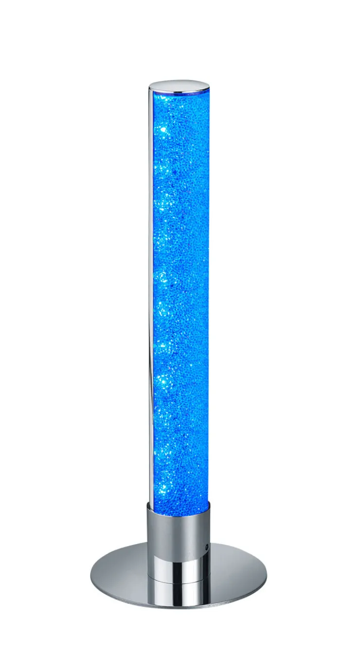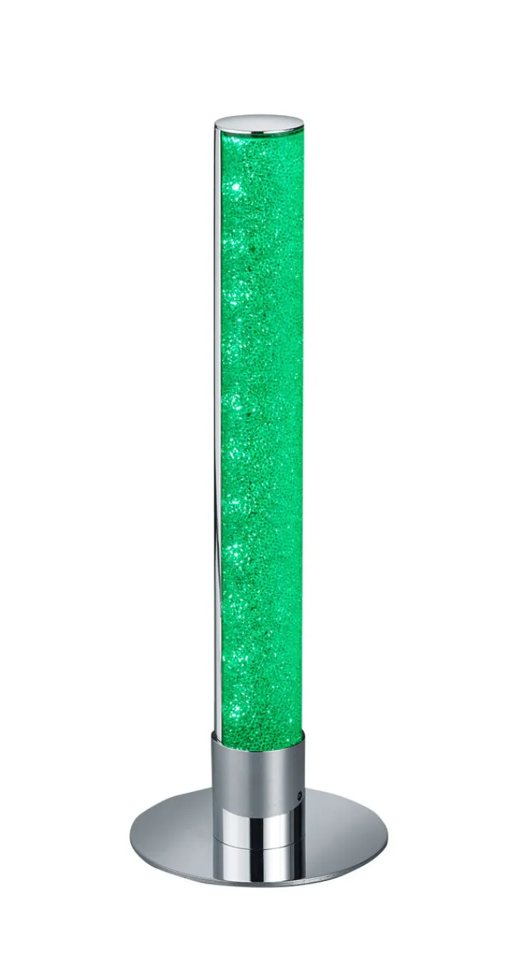Die RL LED Tischlampe LEIA mit Fernbedienung ist chromfarbig und transparent und hat eine Höhe von 40 cm. Sie eignet sich als Dekolampe und sorgt für eine angenehme Hintergrundbeleuchtung.