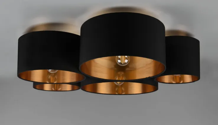 Die goldfarbige Innenseite bildet einen optisch reizvollen Kontrast zur schwarzen Außenseite der Textilschirme und ist ein schöner Blickfang an jeder Decke. Die Lampe ist geeignet für jeweils 42 W / E27 Leuchtmittel und sorgt für eine angenehme Ausleuchtung von Wohnräumen oder des Flurbereichs.