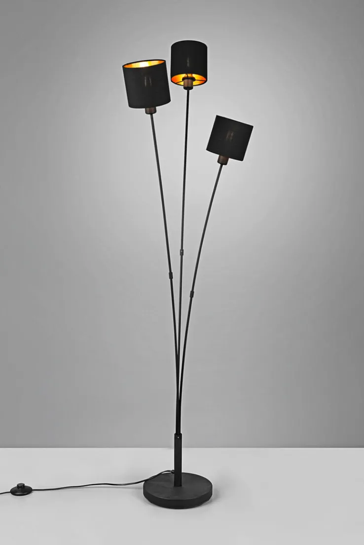 Modernes Design und wohnlich warmes Licht bietet die 150 cm hohe RL Retrofit Stehlampe TOMMY mit ihren drei unterschiedlich ausgerichteten Spots. Die außen schwarz und innen goldfarbig gehaltenen Metallschirme zaubern ein gemütliches Ambiente in Wohn- oder Schlafräume. Für die komfortable Bedienung ist die Leuchte mit einem Fußschalter ausgestattet.