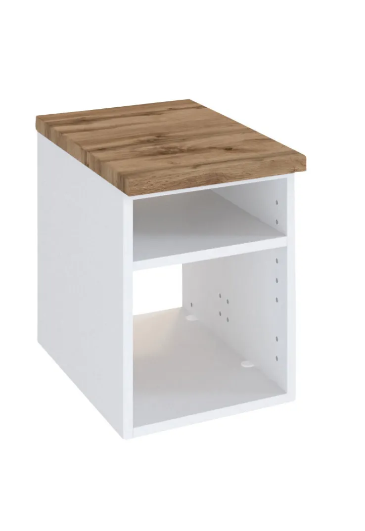 Das offene Regal DAVOS ist 47 cm tief, 30 cm breit und 41 cm hoch. Die Abdeckplatte in Wotan Eiche hebt sich dekorativ vom Korpus ein Weiß matt ab. Ein Einlegeboden trennt das Regal in zwei Fächer.