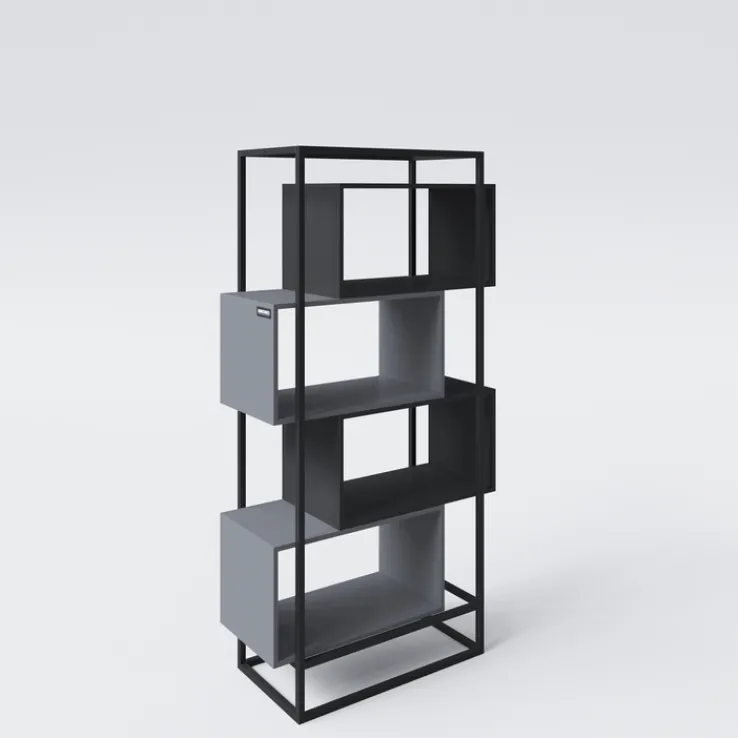 Dieses schwarz-graue Bücherregal überzeugt mit seinem modernen Design: Die seitlich versetzten Fächer sind das markante Merkmal dieses Möbelstücks, das aus robustem Metall und Holznachbildung besteht.