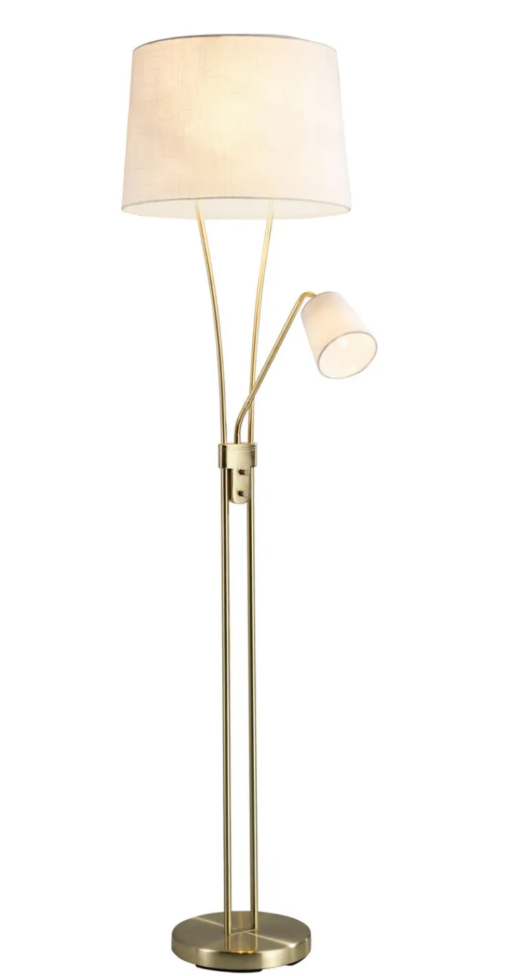 Die Stehlampe aus der Serie MERAN vereint elegantes Design mit praktischer Funktionalität. Mit einer Höhe von 180 cm und einem Durchmesser von 45 cm bietet sie eine beeindruckende Präsenz in jedem Raum. Die Hauptfarbe der Lampe ist goldfarbig, das in Kombination mit dem weißen Textilschirm er5zeugt einen stilvollen Landhaus-Look. Der goldfarbene Metallfuß sorgt für Stabilität und ergänzt das harmonische Gesamtbild. Diese Stehlampe ist mit zwei verschiedenen Fassungen ausgestattet, E14 und E27, die den Einsatz von AGL- und Retrofit-LED-Leuchtmitteln ermöglichen. Die Schutzart IP20 gewährleistet einen sicheren Einsatz im Innenbereich. Die Lampe ist ideal für Wohnräume, in denen sowohl eine angenehme Grundbeleuchtung als auch gezielte Lichtakzente gewünscht sind.