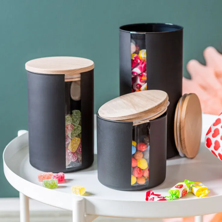 Durch diesen Spalt von wenigen Zentimetern kann der Glasinhalt jederzeit kontrolliert werden. Neigt sich der Vorrat dem Ende zu, wird es Zeit, einkaufen zu gehen. Die Dose gibt keine bestimmten Inhalte vor, also können hier Zucker und Mehl, Salz, aber auch Trockenmüsli, Haferflocken und kleine Nudeln oder Reis bevorratet werden. Die Vorratsdose lässt sich zudem mit weiteren braun-schwarzen Gefäßen kombinieren. So entsteht ein einheitliches Ensemble.