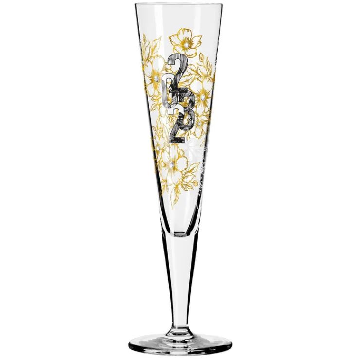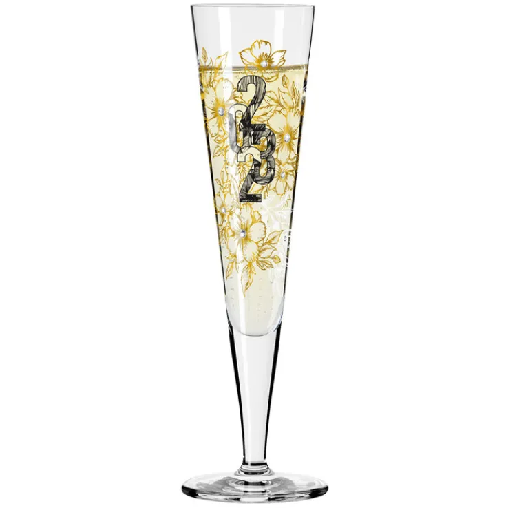 Das RITZENHOFF Champagnerglas BRILLIANTNACHT von R. BOHNENBERG wurde für den Jahreszwechsel 2022/23 entworfen und besteht aus hochwertigem Kristallglas. Inmitten des in echter Goldfarbe gedrucktem Blumenarrangements prangen deshalb die Zahlen 2023 in Schwarz. Zusätzlich sorgen 12 echte Kristalle für strahlende Glanzpunkte. Die Champangerflöte hat eine imposante Höhe von 24 cm und bietet ein Fassungsvermögen von 205 ml. Mit seiner konischen Form wirkt das Champagnerglas klassisch elegant und modern zugleich. Nach Hause kommt die Champagnerflöte in einer edlen Geschenkverpackung, weshalb sie auch als Präsent hervorragend geeignet ist.