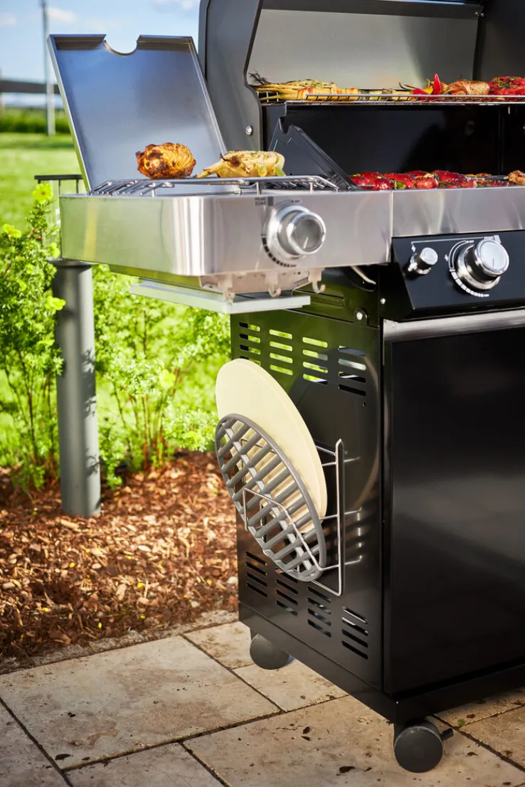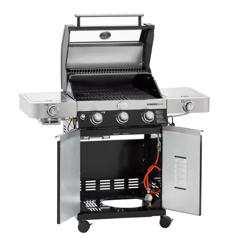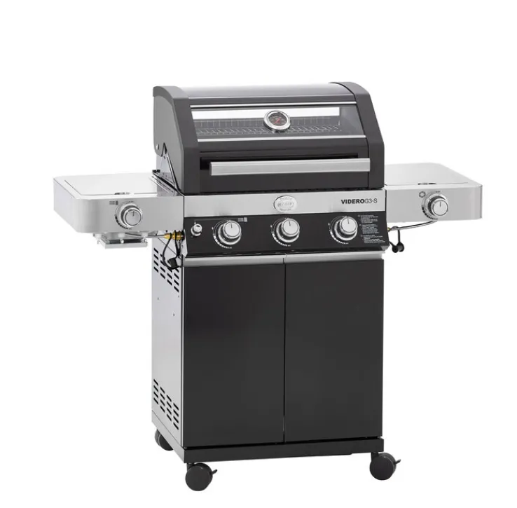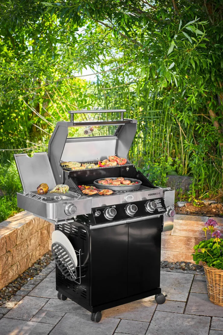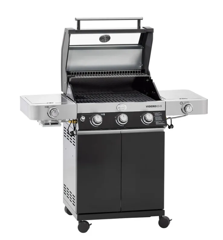 Der Gasgrill der Serie VIDERO G überzeugt mit einer Kombination aus schwarzem und silberfarbenem Design. Die Front und das Gehäuse bestehen aus pulverbeschichtetem Stahl sowie Edelstahl, was für eine robuste und pflegeleichte Oberfläche sorgt. Das Modell ist mit drei Hauptbrennern ausgestattet, die eine gleichmäßige Hitzeverteilung ermöglichen. Die großzügige Grillfläche wird durch seitliche Ablagen ergänzt, die zusätzlichen Platz für Grillzubehör bieten. Ein integriertes Thermometer im Deckel erlaubt eine präzise Temperaturkontrolle während des Grillvorgangs.