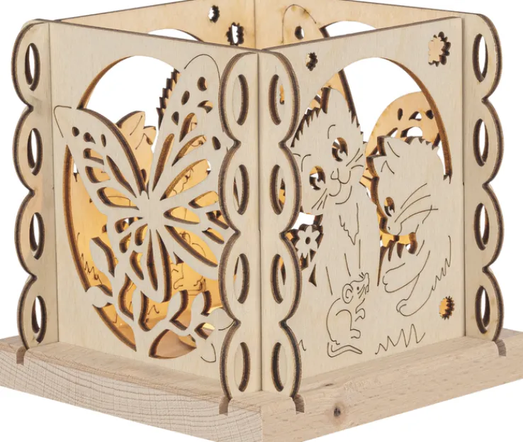 Die Laterne aus der Serie KATZENFREUND besteht aus naturfarbenem, mehrfarbigem Holz und eignet sich für den Einsatz im Innenbereich. Sie misst 12 cm in Tiefe, Breite und Höhe, wodurch sie kompakt und vielseitig platzierbar ist. Das Design zeigt filigran ausgestanzte Motive, darunter zwei Katzen, einen Schmetterling, eine Maus sowie florale Elemente, die dem Objekt eine dekorative und verspielte Optik verleihen. Die Seiten sind mit feinen, ornamentalen Ausschnitten versehen, die für interessante Licht- und Schattenspiele sorgen.