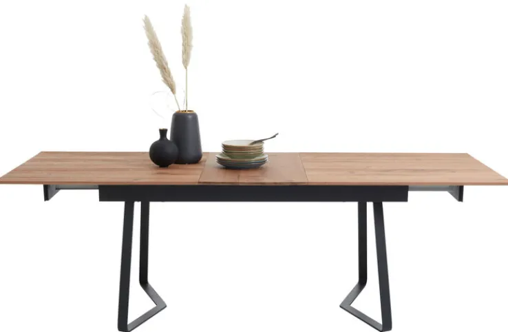 Der im avantgardistischen Stil designte Esstisch fasziniert mit einem kunstvoll arrangierten Gestell. Die grauen Kufen aus robustem Metall haben am Boden eine nach innen geformte Gestaltung. Die Tischplatte besteht aus massiver Kerneiche Umato. Das Modell ist ausziehbar. Die Einlage für die Verlängerung befindet sich genau in der Mitte des Tisches.