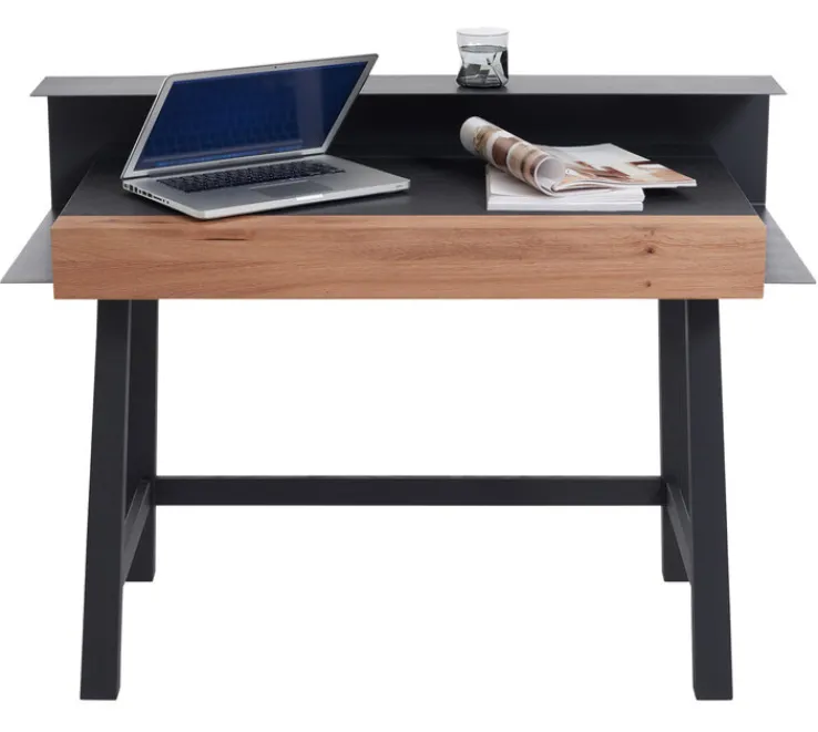 Der Sekretär YORIS hat eine Größe von 60 x 87 x 120 cm und vereint sein Vierfußgestell grauem Metall mit einer grauen Tischplatte aus Kerneiche mit anthrazitfarbiger Metallblende. Unter der verschiebbaren Tischplatte gibt der Schreibtisch jede Menge Stauraum frei. Das versteckte Fach mit integrierter Steckdose mit USB-Ladebuchse ist perfekt um Arbeitsunterlagen zu verstauen, während die erhöhte Metallblende Platz zum Abstellen von Schreibutensilien oder Dekorationen bietet.