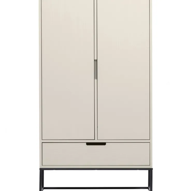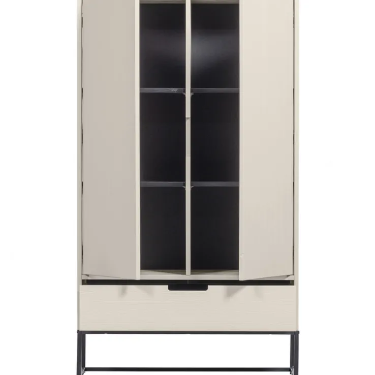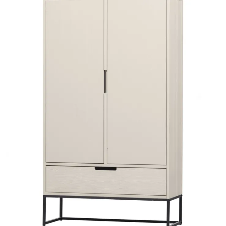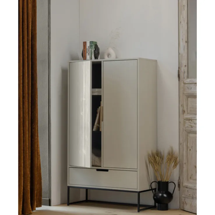 Sein zeitlos elegantes Erscheinungsbild macht den Schrank SILAS zum vielseitig kombinierbaren Möbelstück. So bietet er sich als Garderobenschrank für die Diele ebenso an wie als zusätzlicher Stauraum im Wohn- oder Schlafzimmer. Hinter zwei Drehtüren stehen insgesamt sechs Ablagefächer zur Verfügung. Weitere Dinge lassen sich im unteren Schubkasten verstauen. Der schwarze Metallsockel bildet einen attraktiven Kontrast zu den hellen Fronten und erlaubt die einfache Reinigung unter dem Schrank.