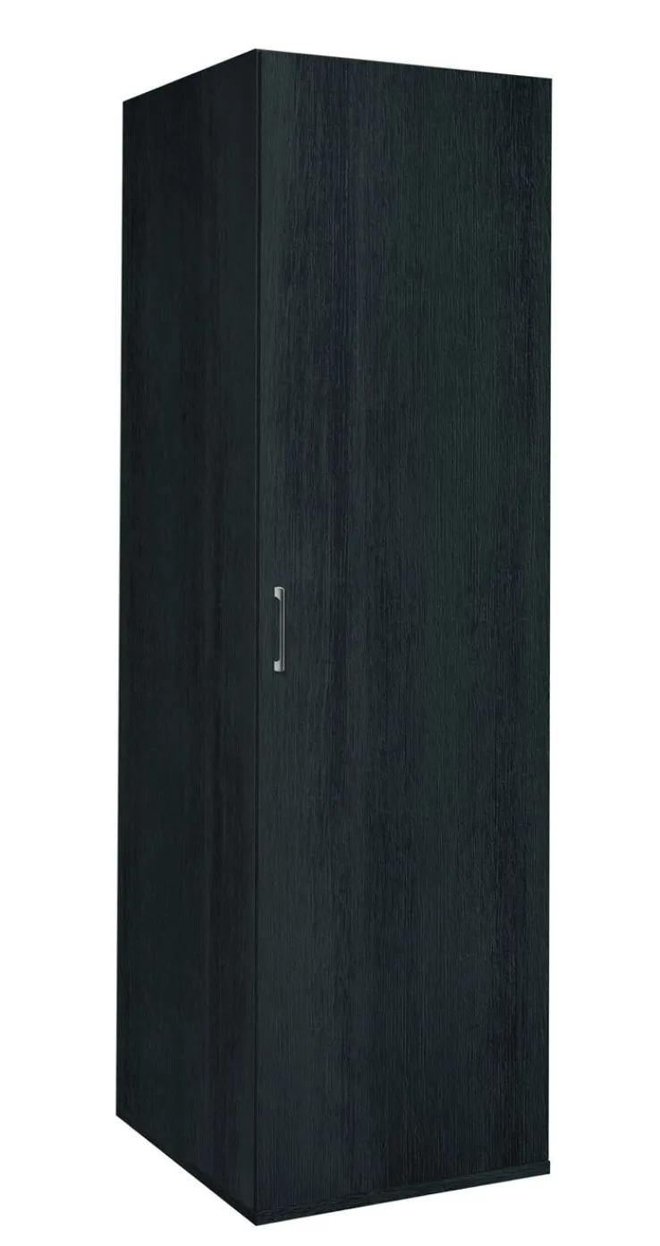 Der Schrank WASHTOWER VI ist komplett schwarz. Gewünschte Einlegeböden müssen zusätzlich bestellt werden. Die Breite liegt bei 60 cm, die Höhe bei 206 cm und die Tiefe bei 65,5 cm. Der Hochschrank besitzt 1 Drehtür mit silberfarbigem Griff.