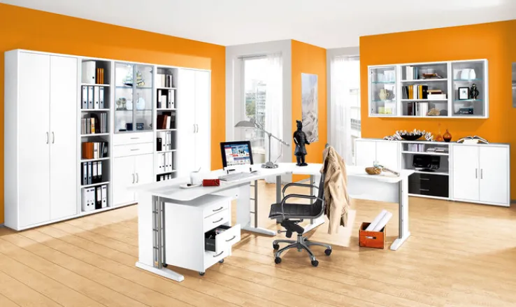Ordner und Unterlagen bietet. Mit einem Drehstuhl kombiniert, ergibt der moderne Schreibtisch einen funktionellen