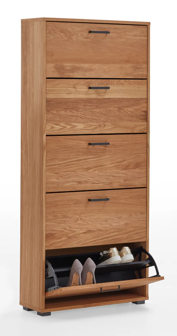 Der Schuhschrank aus furnierter, geölter Eiche ist 78 cm breit und 25 cm tief. Seine Höhe beträgt 170 cm, das Gewicht 52,70 kg. Die fünf Fächer sind mit Schuhwalzen ausgerüstet.