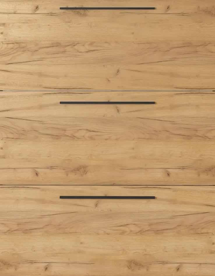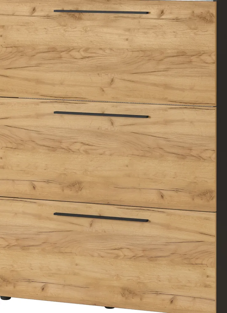 Dieser Schuhschrank begeistert äußerlich durch seinen Kontrast aus einem melaminharzbeschichteten Korpus in Navarra-Eiche-Dekor und Drehgriffen aus schwarzem Metall. Er verfügt über drei Klappen, die insgesamt für 12 Paar Schuhe Platz bieten; Letztere werden durch robuste und hochwertige Metallschuhkörbe gehalten. Somit sorgt dieser Schuhschrank, der mit stoßfesten ABS-Kanten ausgestattet ist, für einen schnellen Zugriff auf die wichtigsten Schuhe und unterstützt damit die Ordnung im Flur. Zudem lassen sich auf seiner Ablage ansprechende Deko-Artikel platzieren.