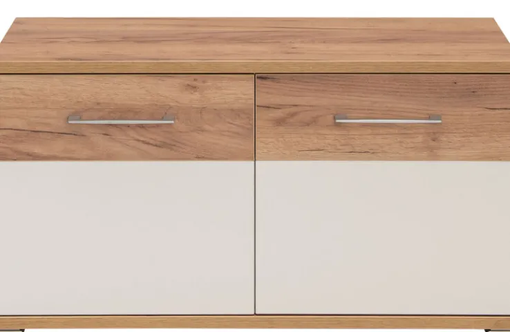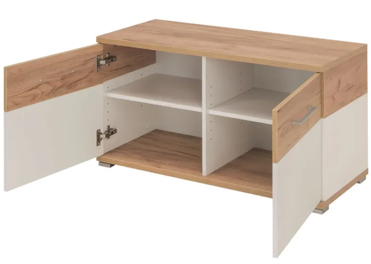 Der auf silberfarbenen Füßen aus Kunststoff ruhende Schuhschrank besticht durch seine freundliche Farbkombination. Sein Korpus ist im oberen Bereich in Navarra Eiche Nachbildung ausgeführt, im unteren Bereich überwiegt pflegeleichtes Weiß. ABS-Kanten und die Beschichtung mit Melaminharz gestaltet das Möbelstück robust und langlebig. An der Vorderseite verschließen zwei Türen mit Türdämpfung Räume mit jeweils einem verstellbaren Einlegeboden. Insgesamt kann das Interieur bis zu acht Paar Schuhe aufnehmen. Unser Shop bietet Ihnen auch ein passendes Sitzkissen zum Wechseln der Schuhe an.
