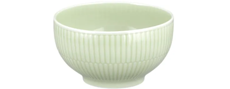 Diese Schale aus der Serie AMINA zeichnet sich durch ihre grüne Farbgebung und ein feines, vertikal geriffeltes Reliefmuster an der Außenseite aus. Das matte, pastellgrüne Porzellan ist glasiert und verleiht dem Objekt eine glatte und pflegeleichte Oberfläche. Die Schale ist rund geformt und besitzt einen leicht ausgestellten Rand sowie einen kleinen Standfuß, der für Stabilität sorgt.