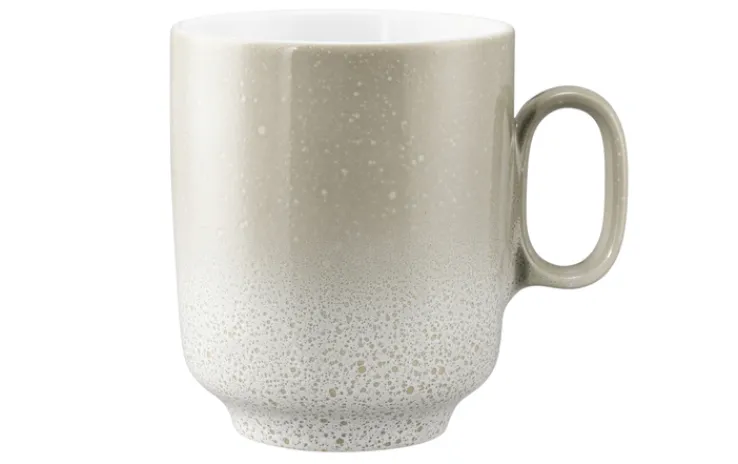 Dieser Kaffeebecher aus der Serie SENTO HOME von Seltmann Weiden besteht aus Porzellan und präsentiert sich in einer harmonischen Farbkombination von Beige und Weiß. Die Oberfläche zeigt einen sanften Farbverlauf von einem warmen Beigeton im oberen Bereich zu einem helleren, fast weißen Ton im unteren Bereich. Die charakteristische, leicht gesprenkelte Struktur verleiht dem Becher eine dezente, moderne Optik, die sich gut in verschiedene Küchenumgebungen einfügt. Die Form ist zylindrisch mit einem leicht ausgestellten Boden und einem stabilen Henkel, was für eine angenehme Handhabung sorgt. Mit den Maßen 12,10 cm Tiefe, 8,80 cm Breite und 10,40 cm Höhe sowie einem Fassungsvermögen von 430 ml eignet sich der Becher ideal für Kaffee oder andere Heißgetränke. Das Gewicht beträgt 0,327 kg. Das lebensmittelgerechte Porzellan bietet eine glatte, pflegeleichte Oberfläche.
