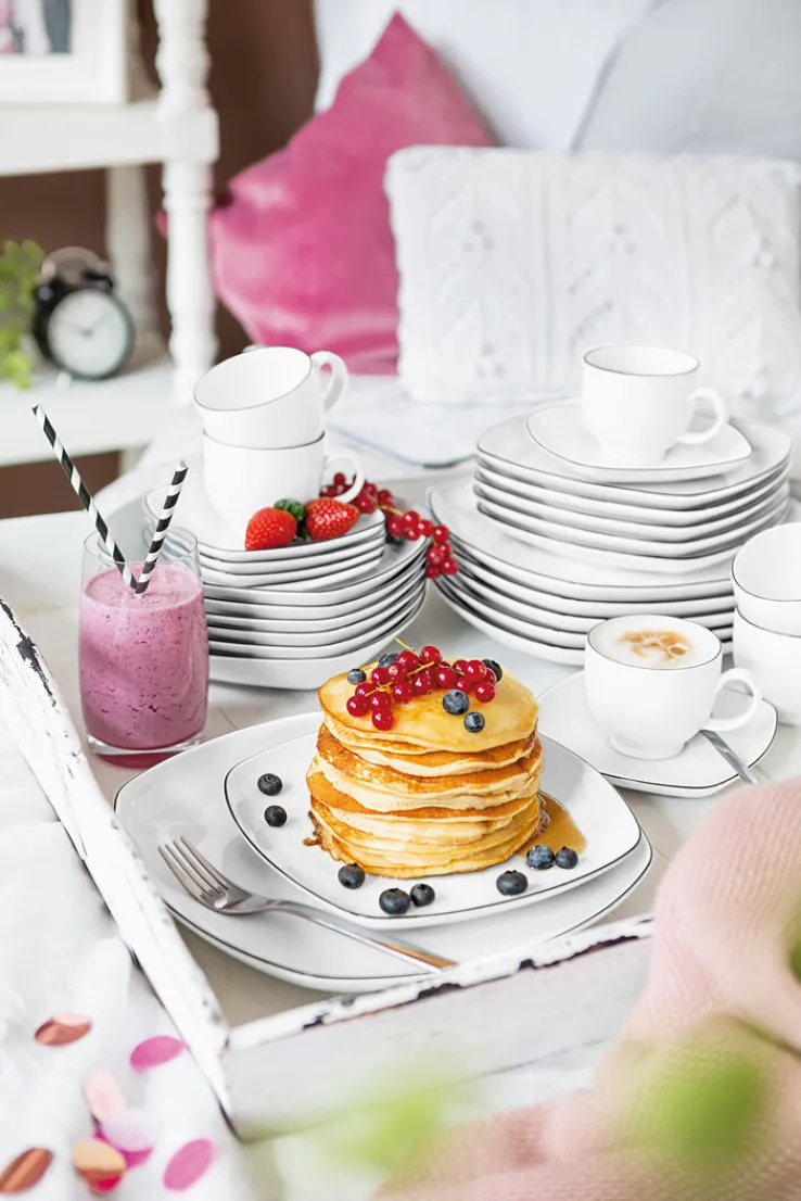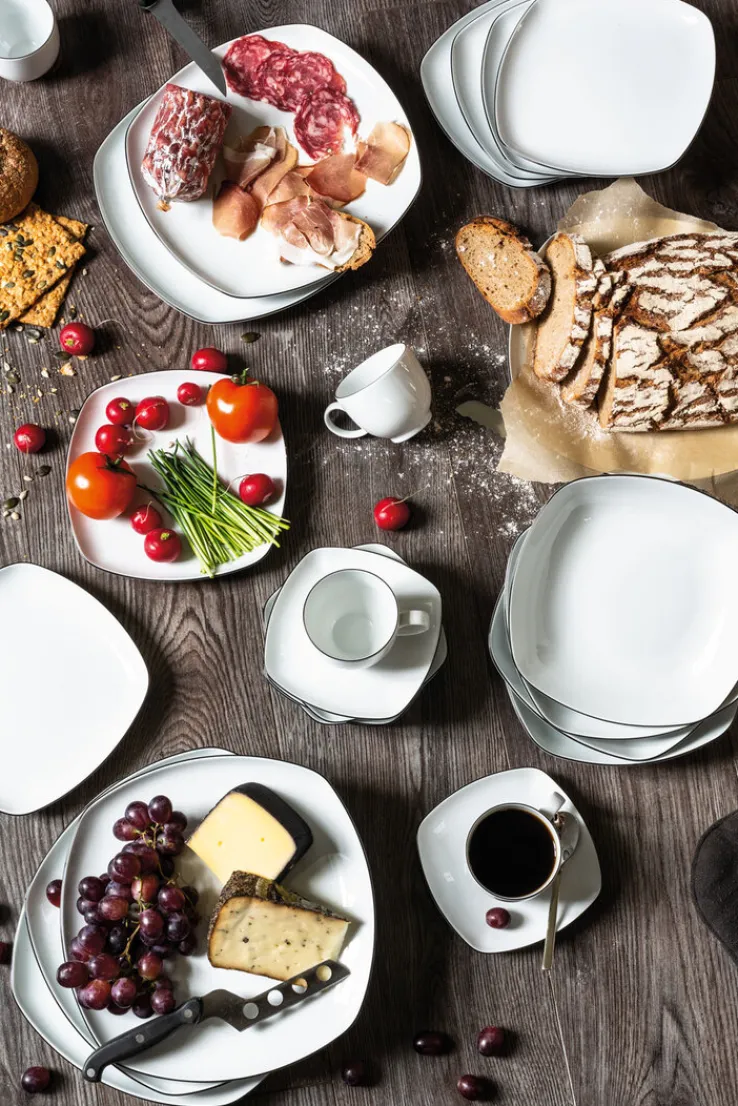 Ob beim gemütlichen Abendessen mit der Familie, bei der Grillparty mit Freunden oder zum Geburtstagsdinner: Mit der Servierplatte LIDO aus dem Hause Seltmann Weiden gelingt es bei jeder Gelegenheit, Speisen appetitanregend zu servieren. Die eckige Platte besteht aus weißem Porzellan und ist mit einem schmalen, schwarzen Rand verziert. Die hochwertige Keramik ist backofengeeignet, mikrowellengeeignet und selbstverständlich spülmaschinenfest. Einen besonders stilvollen Eindruck macht die Servierplatte in Kombination mit weiterem Geschirr aus der Seltmann Weiden Serie LIDO.