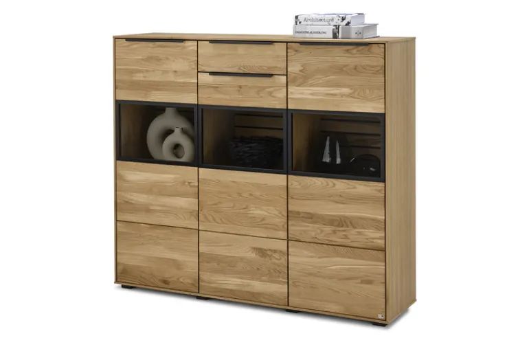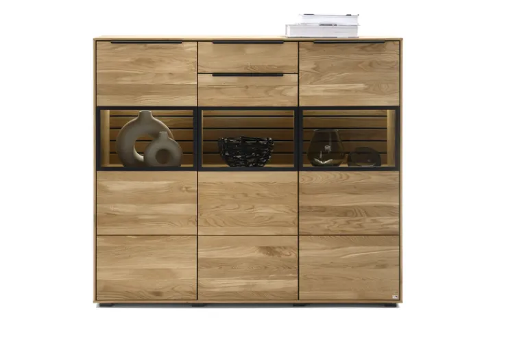 Was das set one by Musterring Highboard JACKSON aus Eiche massiv zusätzlich in den Fokus rückt, ist die LED Beleuchtung. Trafo und Fußschalter sind im Lieferumfang enthalten. Ebenso wie drei Drehtüren mit Glasausschnitt in getöntem Graphit-Look und drei Einlegeböden. Der schwarze Aluminium Rahmen des Sideboards ist pulverbeschichtet – für maximale Qualität.