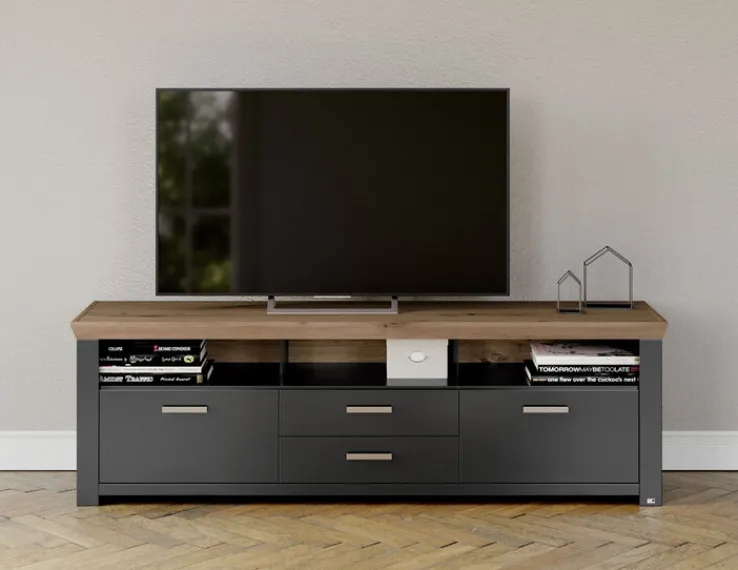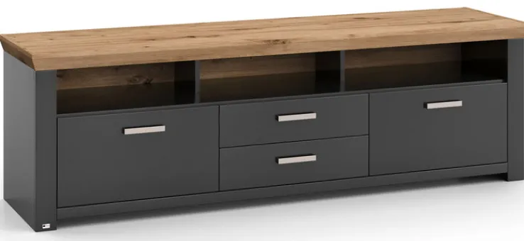 Mit dem modernen set one by Musterring Lowboard YORK 35 in Anthrazit/ Eiche Artisan erhält das Fernsehgerät einen gebührenden Standort, der viel Platz für Zubehör bietet.