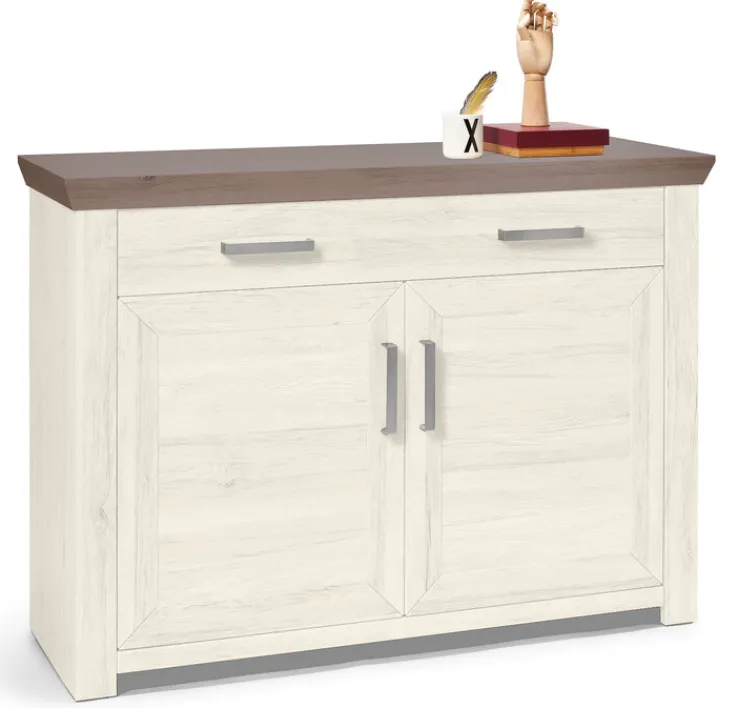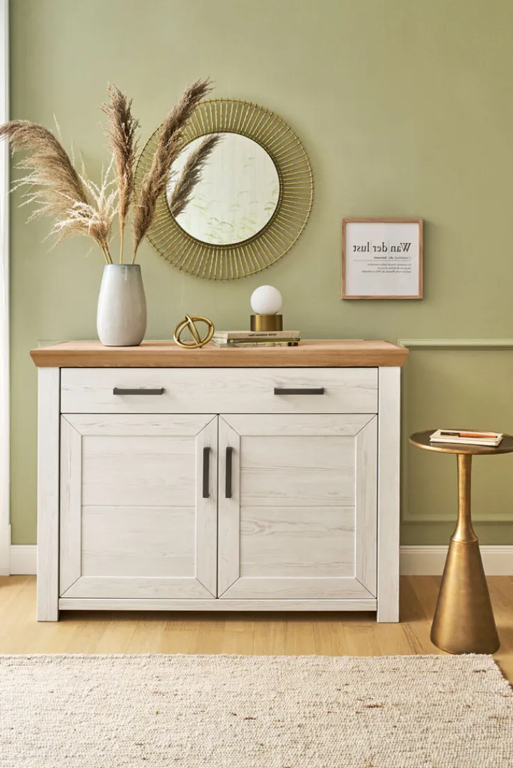 Front und zwei Türen mit Stauraum für viele nützliche Dinge. Auf dem Sideboard ist ausreichend Platz für Multimedia-Geräte oder Dekoratives. Es fügt sich durch die elegante Schlichtheit gut in bestehenden Wohnkontext ein und