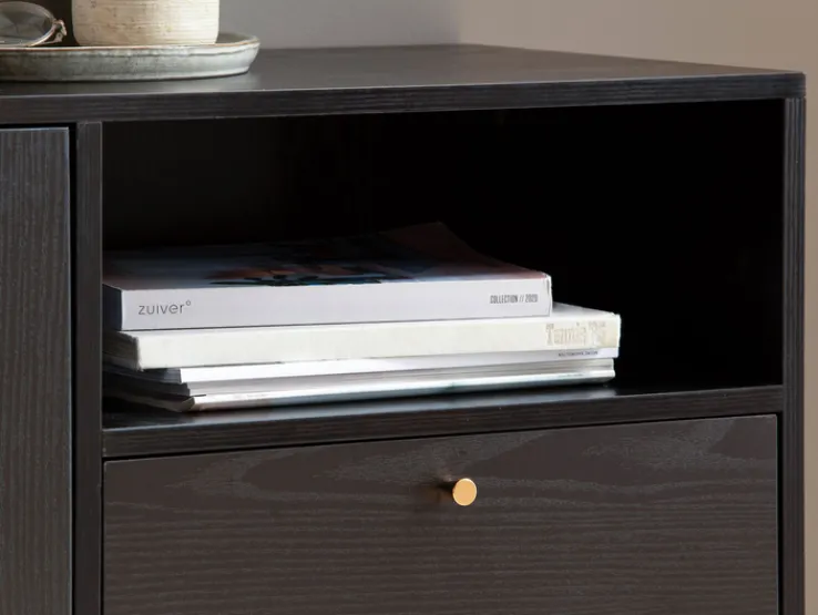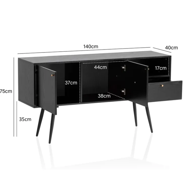 Das schwarze Sideboard sorgt zudem für flexibel nutzbaren Stauraum: Zum Beispiel hinter den zwei großen verschließbaren Türen oder der kompakten Schublade. Als Präsentationsfläche für schöne Erinnerungsstücke oder Deko-Artikel könnte indes die freie Fläche dienen. Die pulverbeschichteten Metallbeine sorgen für Langlebigkeit und unterstreichen die elegante Wirkung – zum Beispiel im Wohn- oder Schlafzimmer.